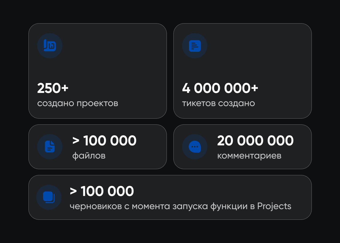 Projects — наш самый популярный сервис: им пользуется почти каждая компания в LeeCyber. В течение года мы регулярно обновляли и улучшали его: добавили проекты с разграничением доступа по сотрудникам, интеграцию с Docs, Drive и HRM, полностью переписали текстовый редактор и внедрили инструменты на базе ИИ (Wingman). Теперь создание тикета занимает всего пару кликов вместо прежних десяти.