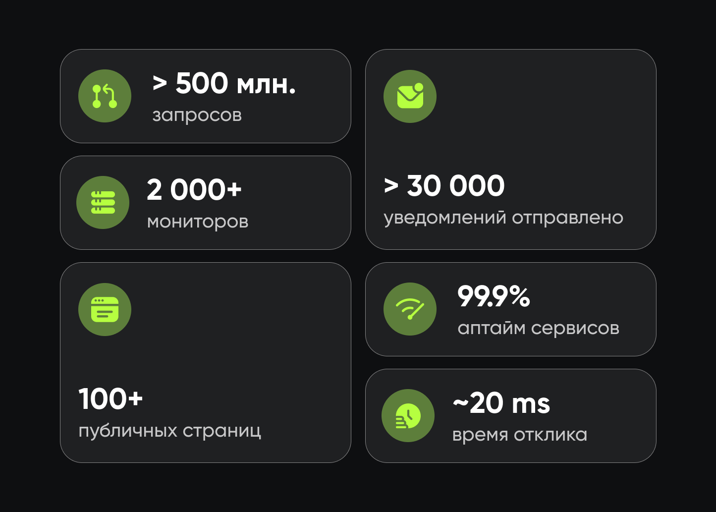 Благодаря этому результат не заставил себя ждать — уже создано более 2 000 мониторов в Status. Каждый день наши серверы отправляют десятки тысяч проверок, чтобы оперативно уведомлять вас о сбоях в работе ресурсов. Кстати, аптайм наших собственных сервисов в 2025 году составил 99,9%.